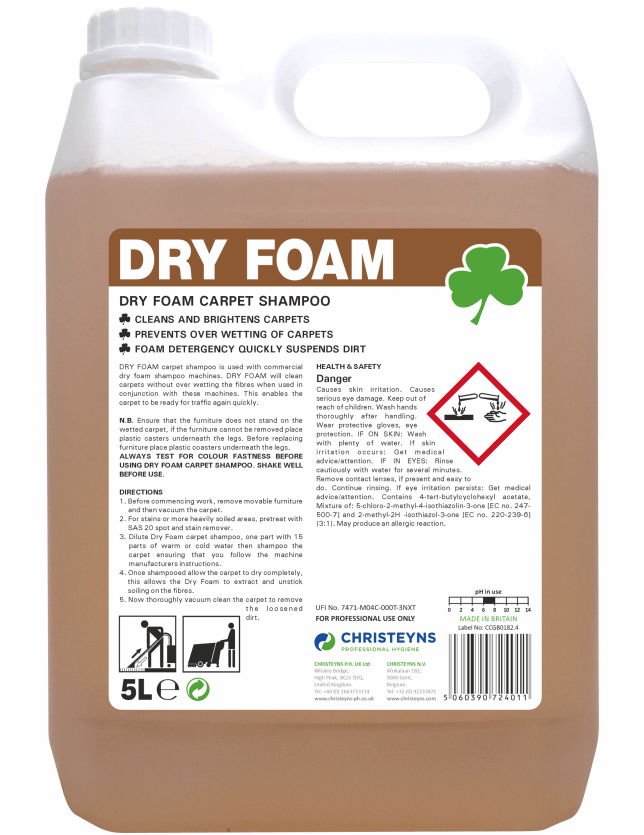 Revolutionise your carpet cleaning regimen with Dry Foam Carpet Shampoo by Clover Chemicals. Engineered for efficiency and exceptional results, this advanced formula delivers a powerful clean without the risk of over-wetting, ensuring rapid drying times and significantly reducing the potential for re-soiling. Ideal for high-traffic environments where quick turnaround is essential, Dry Foam is the go-to choice for hotels, clubs, public houses, nursing and residential homes, offices, and even car valeting businesses.