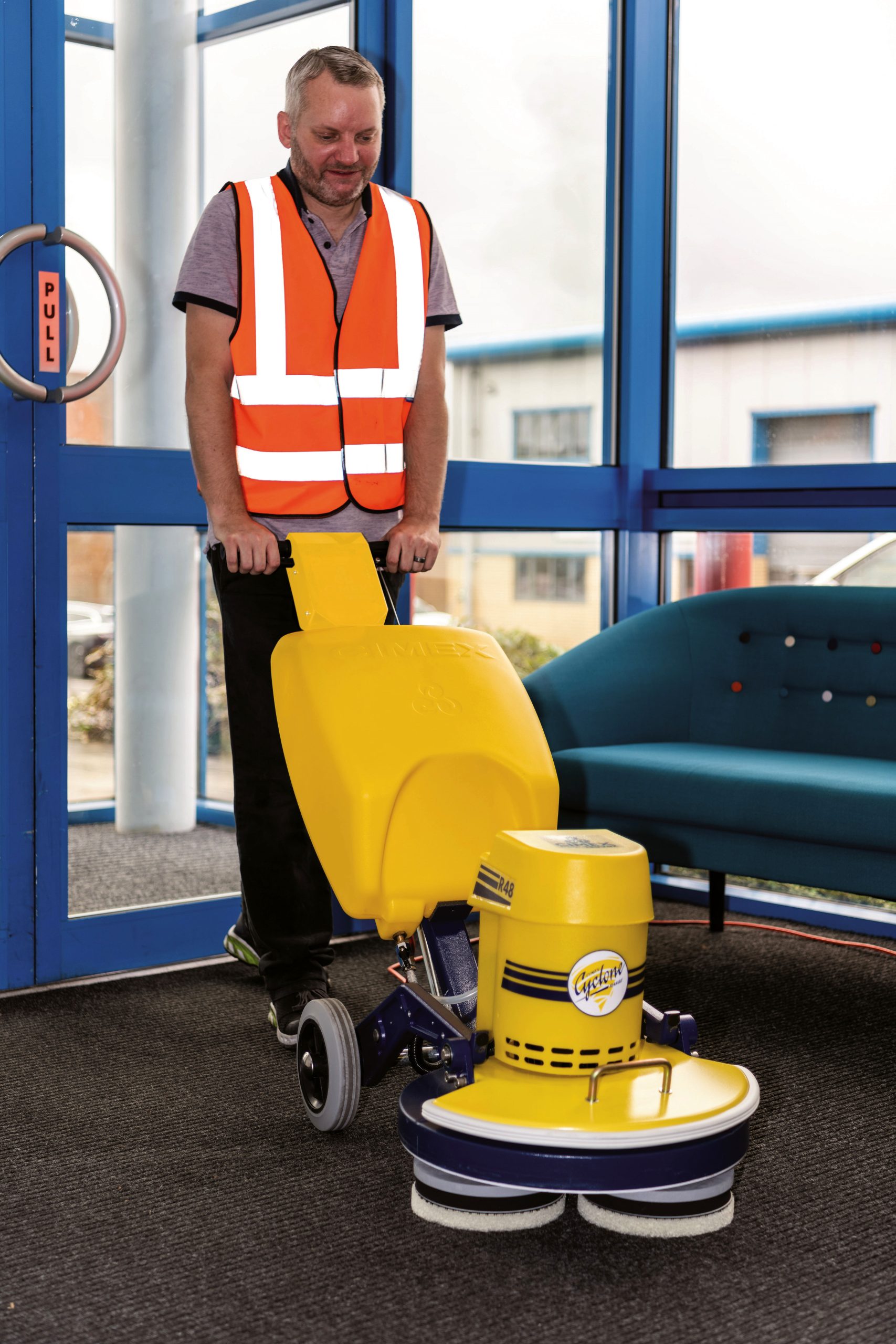 A high productivity, cost effective, low moisture carpet cleaning system, which is six times more productive than a single disc rotary when cleaning carpets.